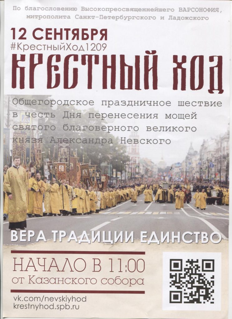 Дорогие друзья, братья и сестры! Призываем вас прийти 12 сентября к Казанскому собору и всем вместе принять участие в общегородском шествии — Александро-Невском крестном ходе в честь небесного покровителя Санкт-Петербурга.