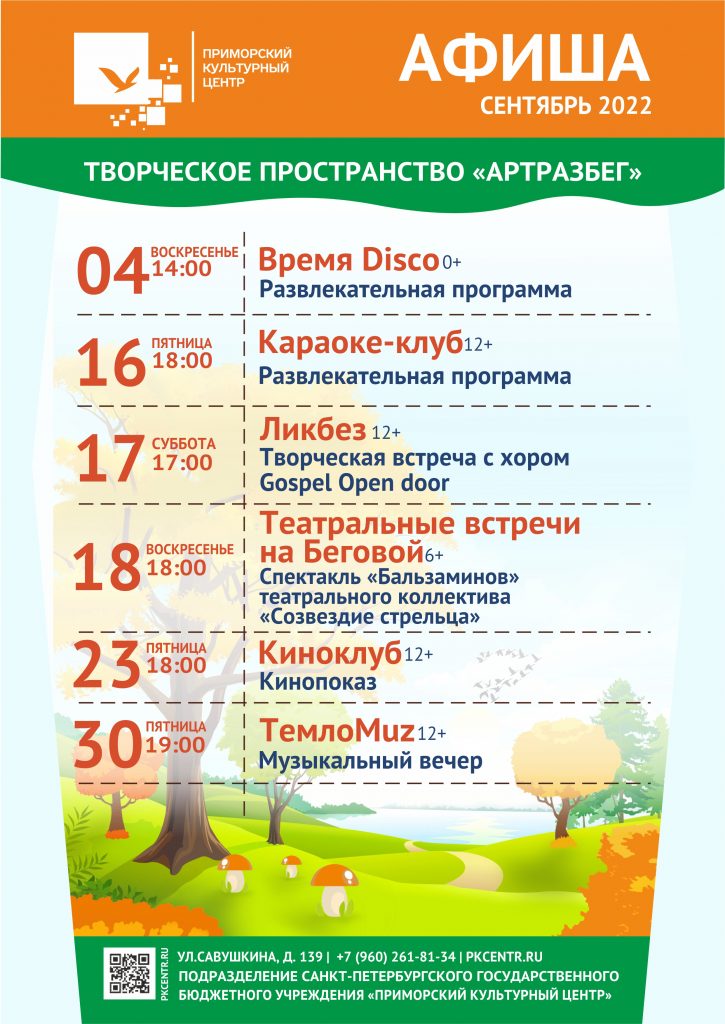 Афиша на сентябрь Домов культуры Приморского культурного центра