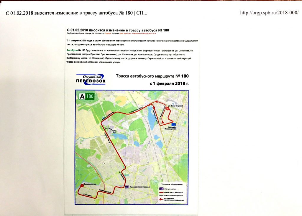 С 1 февраля 2018 года, в целях обеспечения транспортного обслуживания жителей нового жилого квартала на Суздальском шоссе, продлевается трасса автобусного маршрута № 180.