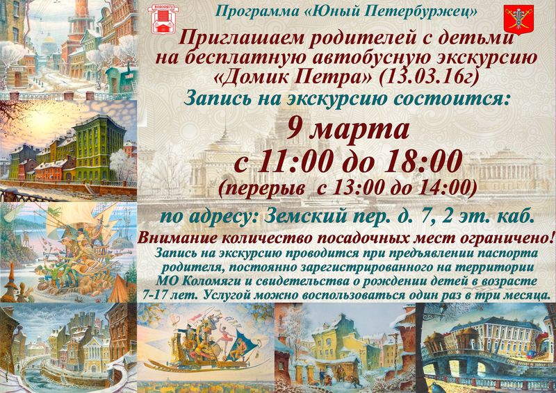 Уважаемые жители МО Коломяги, приглашаем родителей с детьми на бесплатную экскурсию «Домик Петра».