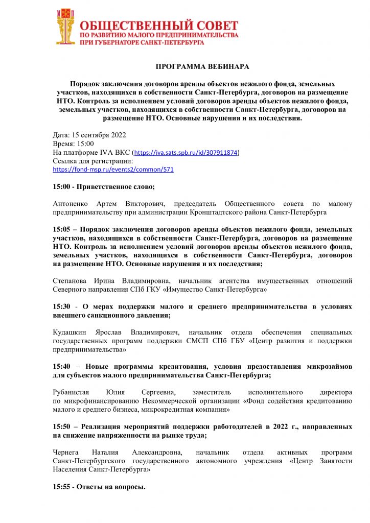 15 сентября 2022 года в 15:00 Общественный Совет по малому предпринимательству при главе администрации Приморского района Санкт-Петербурга в рамках реализации плана мероприятий по развитию малого бизнеса на территории Приморского района организует проведение бесплатного онлайн вебинара для субъектов малого предпринимательства на тему: «Порядок заключения договоров аренды объектов нежилого фонда, земельных участков, находящихся в собственности Санкт-Петербурга, договоров на размещение НТО. Контроль за исполнением условий договоров аренды объектов нежилого фонда, земельных участков, находящихся в собственности Санкт-Петербурга, договоров на размещение НТО. Основные нарушения и их последствия».