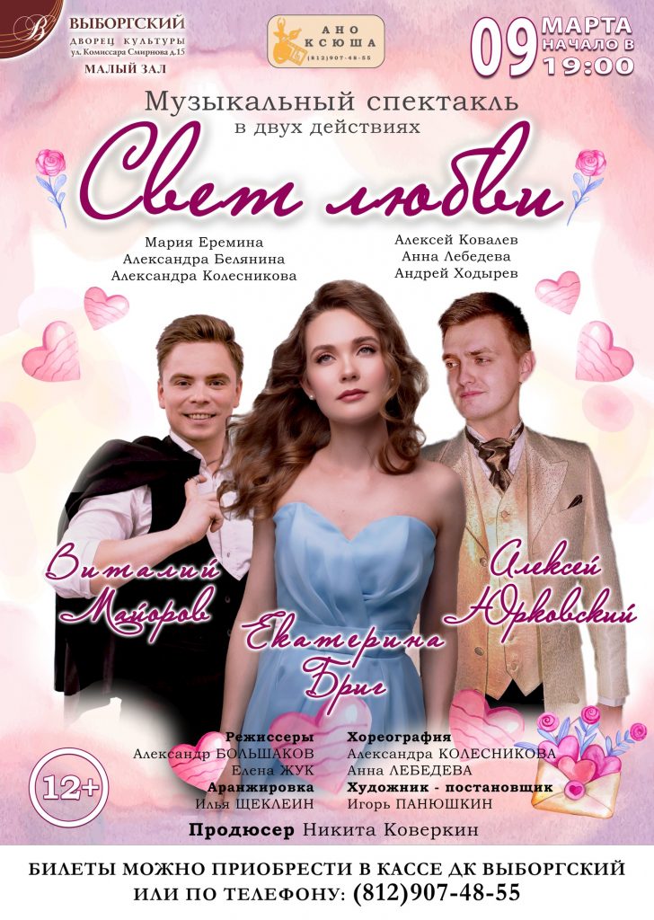СВЕТ ЛЮБВИ – это история девушки, вошедшей во взрослую жизнь с открытым сердцем, распахнутыми глазами и с надеждой на встречу с настоящим счастьем в любовью. Она обязательно встретит того, кто на веки пройдет с ней по жизни в любви и согласии — но жизненный путь, путь любви, тернист и очень не прост. СВЕТ ЛЮБВИ – это и мелодии любви и мелодии светлой печали, надежды и грезы — всё это зритель увидит и услышит в спектакле. СВЕТ ЛЮБВИ — лирический спектакль с элементами и комедии и драмы, Свет любви — для тех, кто любит хорошие песни и красивую музыку.