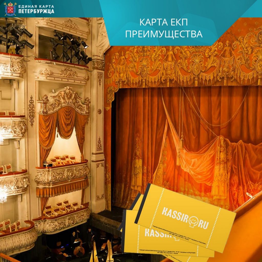 Кроме того, держатели карты могут приобрести билеты на культурные мероприятия, проходящие в Санкт-Петербурге, без сервисного сбора в любой кассе Дирекции театрально-зрелищных касс. Для этого перед оплатой билета необходимо предъявить свою ЕКП.