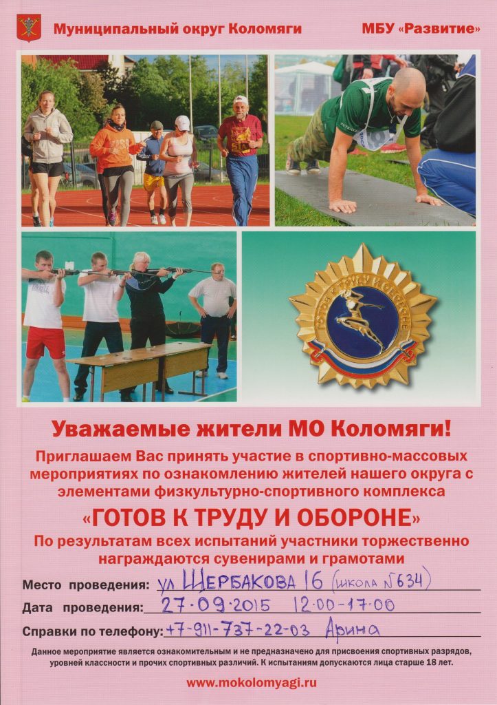 Уважаемые жители! Приглашаем вас принять участие в спортивно-массовом мероприятии «Готов к труду и обороне» — 27 сентября 2015 г. в 12.00, стадион школы №634 (ул. Щербакова, д.16)