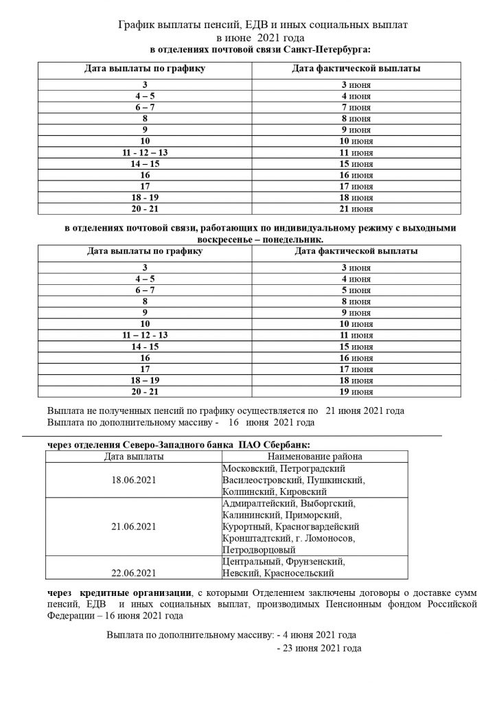 График выплаты пенсий, ЕДВ и иных социальных выплат в июне 2021 года в отделениях почтовой связи Санкт-Петербурга