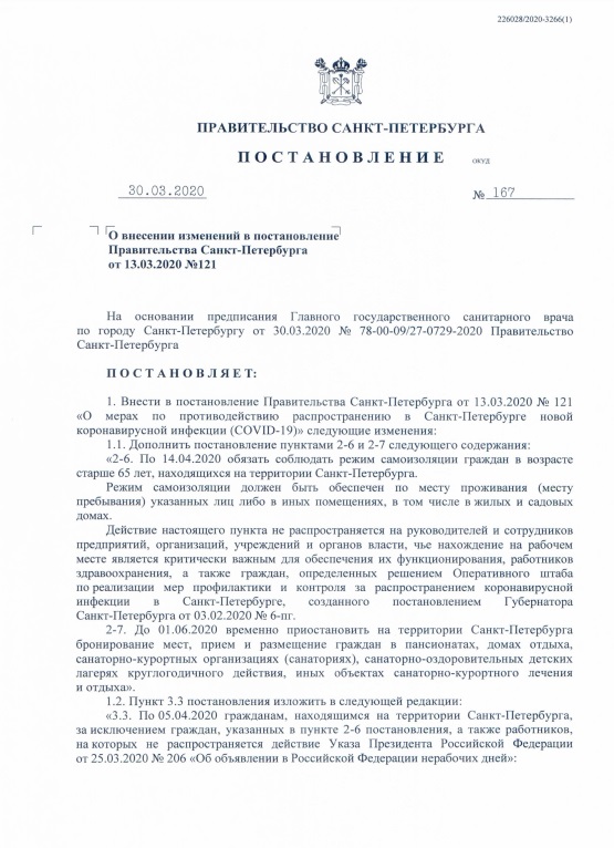 Губернатор Александр Беглов подписал постановление Правительства Санкт-Петербурга «О внесении изменений в постановление Правительства Санкт-Петербурга от 13.03.2020 № 121».