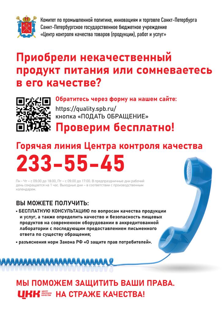 Санкт-Петербургское государственное бюджетное учреждение «Центр контроля качества товаров (продукции), работ и услуг» (далее – СПб ГБУ «ЦККТРУ»), подведомственное Комитету по промышленной политике, инновациям и торговле Санкт- Петербурга, оказывает государственную услугу по обеспечению качества и безопасности продукции, в том числе по выявлению и предупреждению проникновения на потребительский рынок некачественных и опасных для жизни и здоровья потребителей и окружающей среды товаров, работ и услуг на безвозмездной основе.