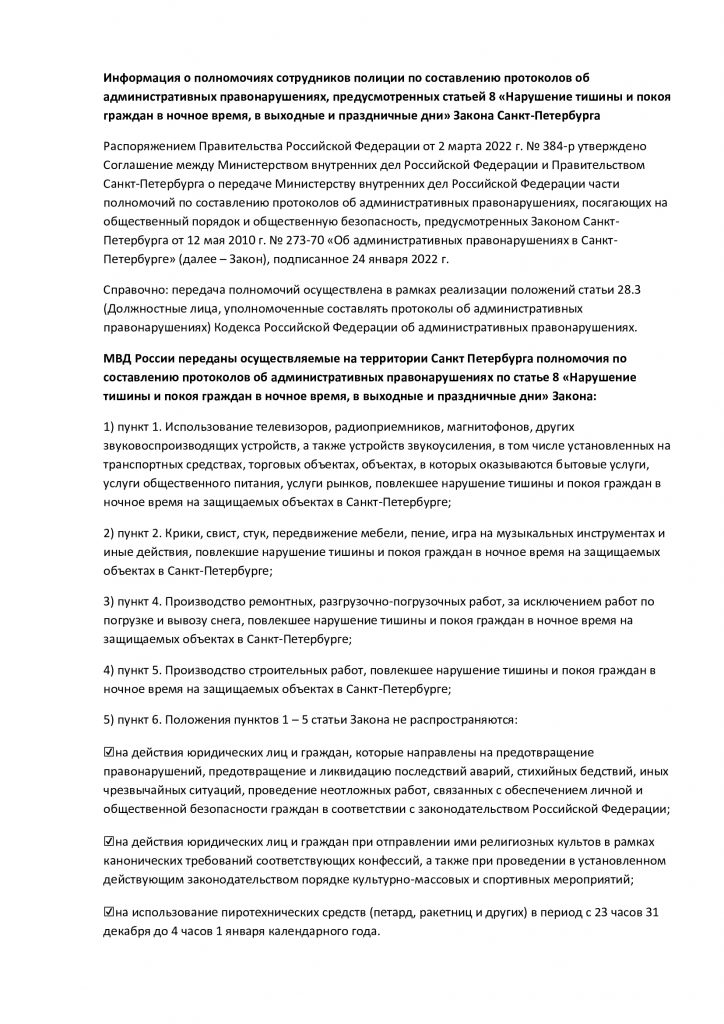 Информация о полномочиях сотрудников полиции по составлению протоколов об административных правонарушениях, предусмотренных статьей 8 «Нарушение тишины и покоя граждан в ночное время, в выходные и праздничные дни» Закона Санкт-Петербурга