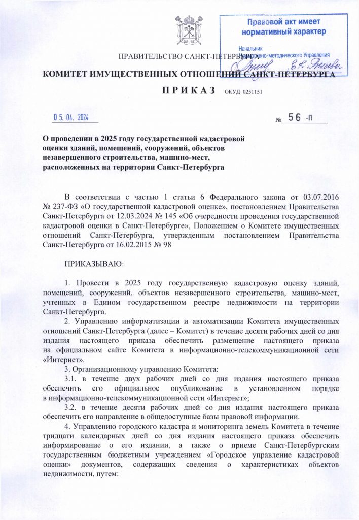 На основании приказа Комитета от 05.04. 2024 № 56-п на территории Санкт-Петербурга в 2025 году будет проведена государственная кадастровая оценка зданий, помещений, сооружений, объектов незавершенного строительства, машино -мест, расположенных на территории Санкт-Петербурга.