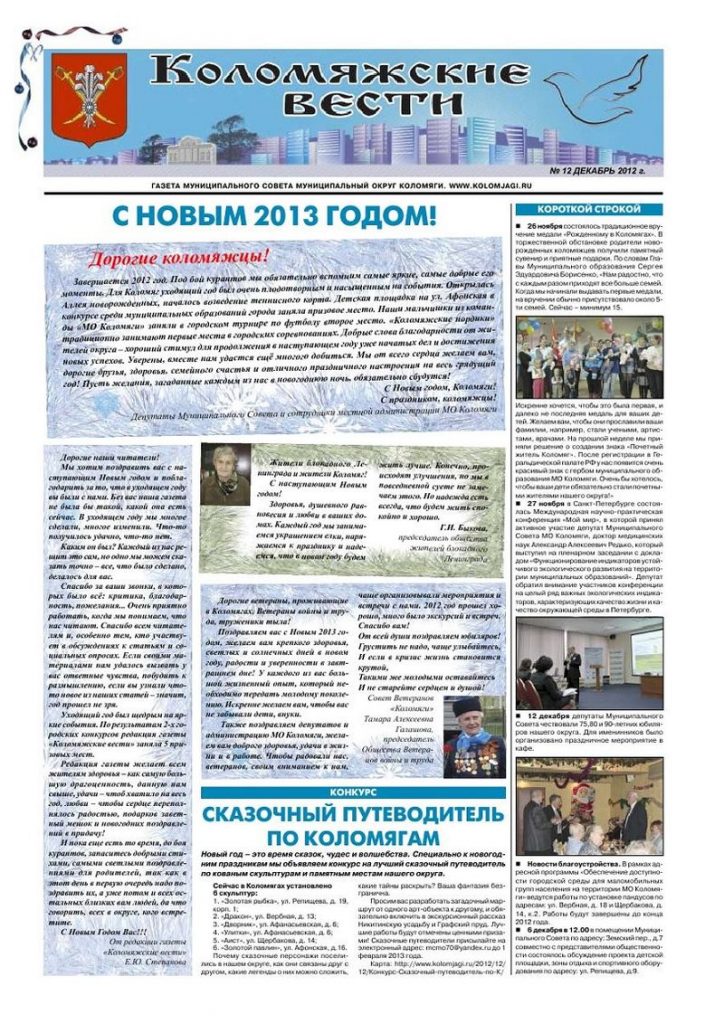 В газете «Коломяжские вести» освещаются проблемы района, спортивные мероприятия, праздничные гуляния, новости благоустройства, опросы, интервью с муниципальными депутатами и многое другое.
