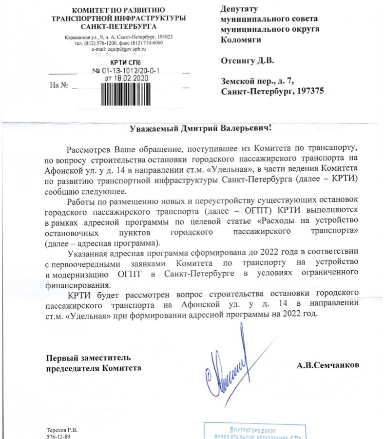 Отсинг Д.В. предложил жителям близлежащих домов заполнить бланки обращения в Комитет, чтобы всем вместе ускорить процесс прохождения согласования данного строительства остановки. Уже собрано более 167-ми листов с подписями жителей. Повторный запрос будет в ближайшее время направлен в Комитет по развитию транспортной инфраструктуры Санкт-Петербурга.