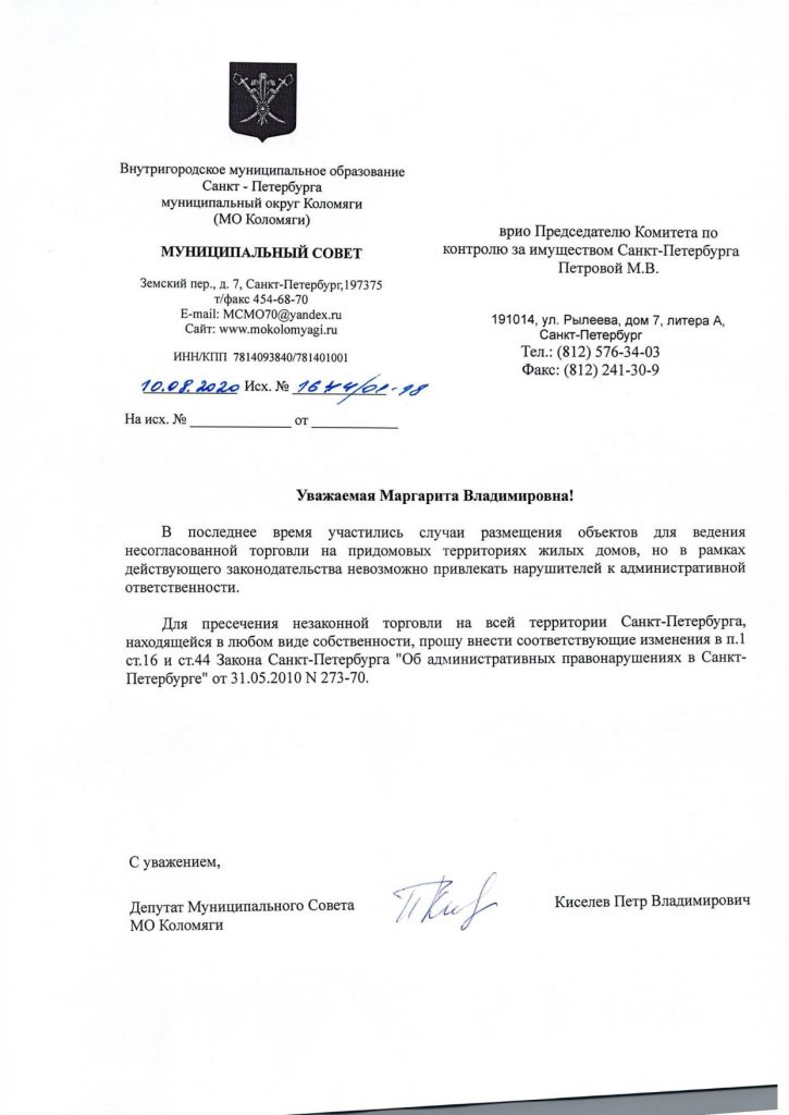 Депутат МС МО Коломяги П.В. Киселев отправил обращение в Комитет по контролю за имуществом Санкт-Петербурга для внесения изменений в законодательство с целью повышения эффективности борьбы с незаконной торговлей на придомовых территориях.