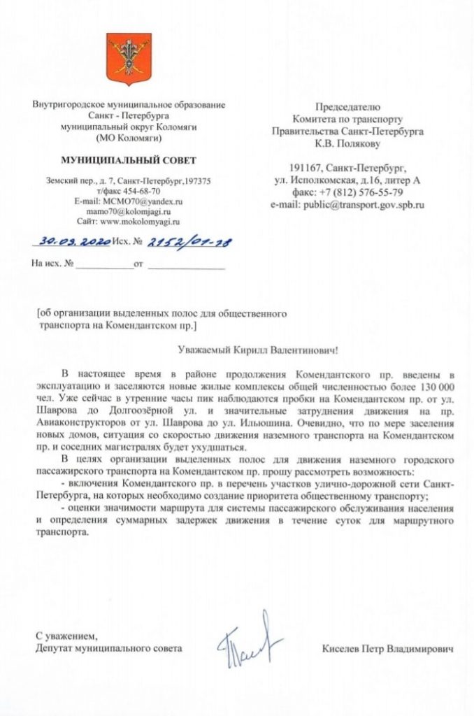 Депутат МС МО Коломяги Петр Владимирович Киселев отправил обращения для увеличения скорости движения транспорта на Комендантском пр. и пр. Авиаконструкторов (запрет парковки и организация выделенных полос для общественного транспорта)