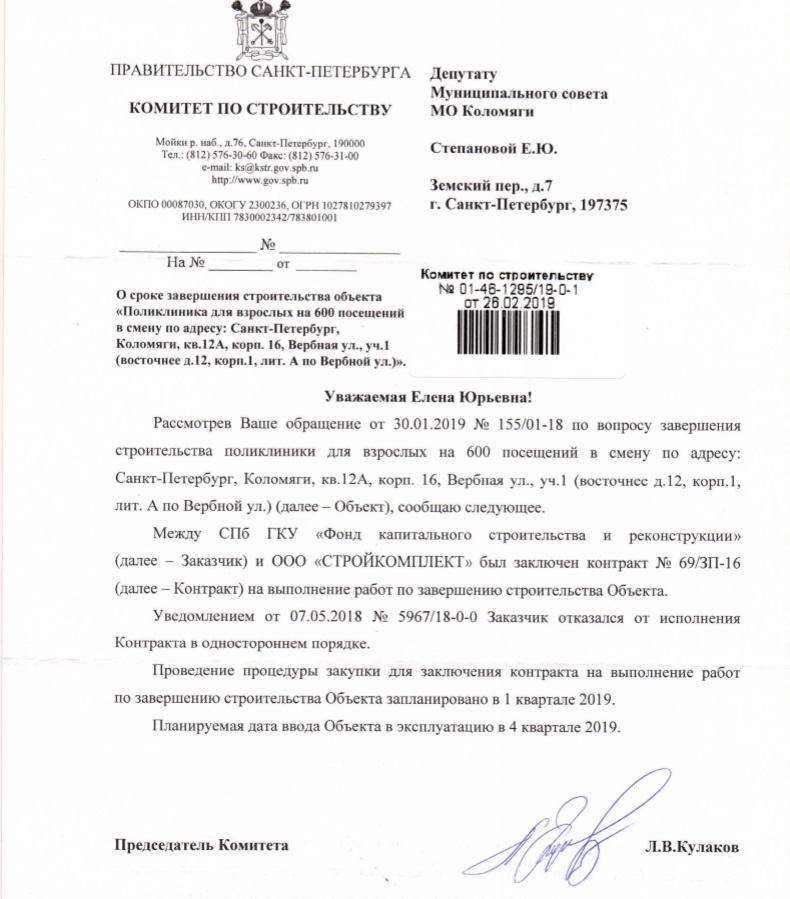 Ответ на обращение по поводу строительства взрослой поликлиники на ул. Вербная