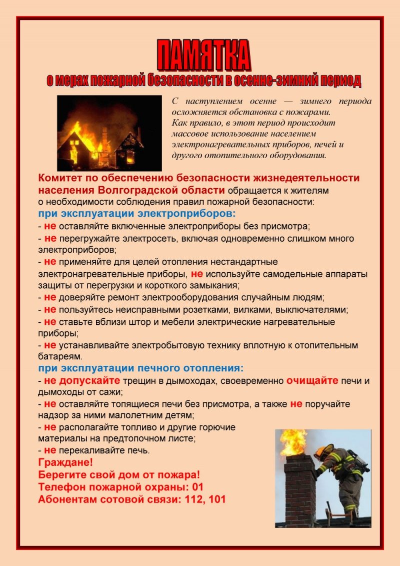 Памятка о мерах пожарной безопасности в осенне зимний период