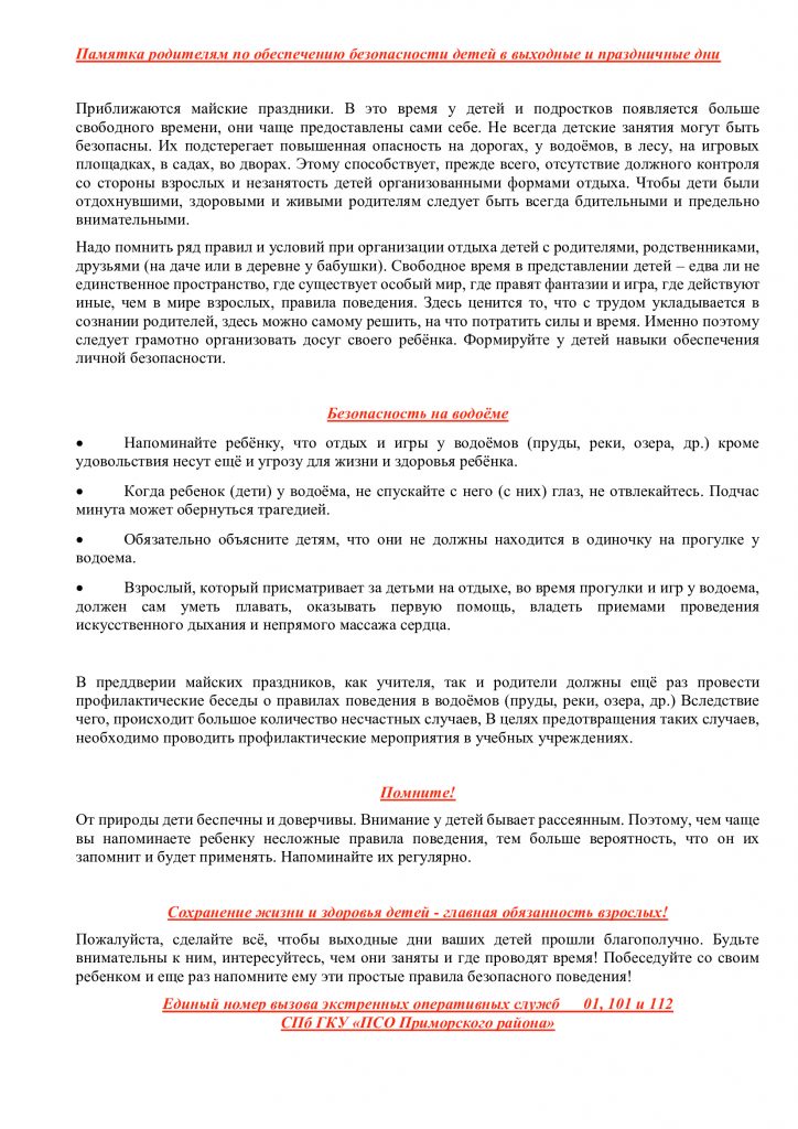 Памятка родителям по обеспечению безопасности детей в выходные и праздничные дни