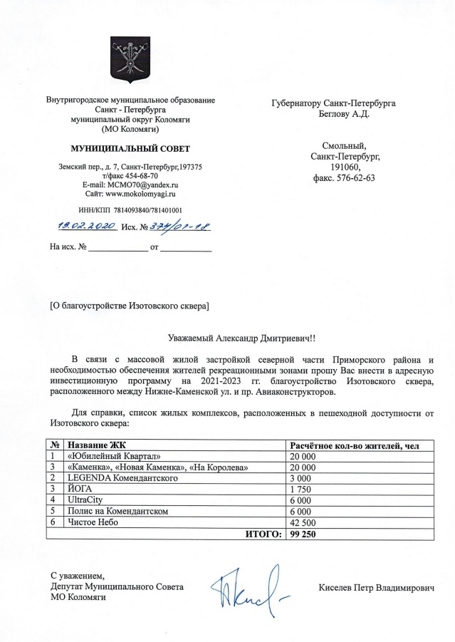 Повторное обращение Губернатору Санкт-Петербурга по вопросу благоустройства Изотовского сквера.