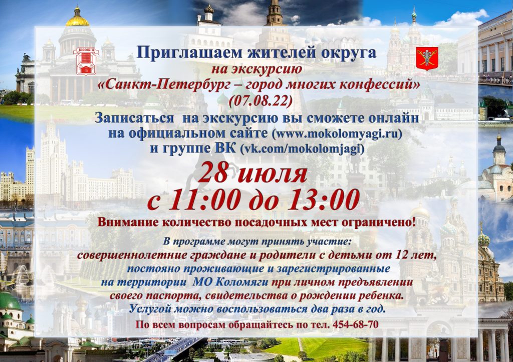 Экскурсии для совершеннолетних граждан и родителей с детьми от 12 лет, постоянно зарегистрированных на территории МО Коломяги.
