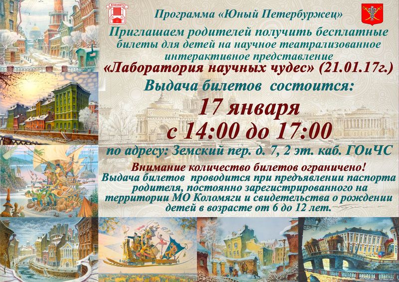 17 января приглашаем получить билеты на научное театрализованное представление в «Лабораторию научных чудес» по адресу: СПб, Земский пер., д.7, 2 этаж, кабинет ГО и ЧС.