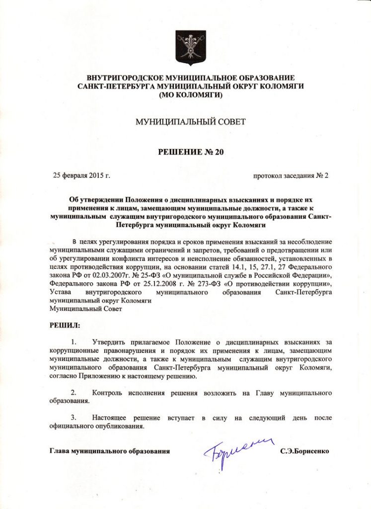 Решение №20 Об утверждении Положения о дисциплинарных взысканиях и порядке их применения к лицам, замещающим муниципальные должности, а также к муниципальным служащим внутригородского муниципального образования Санкт-Петербурга муниципальный округ Коломяги