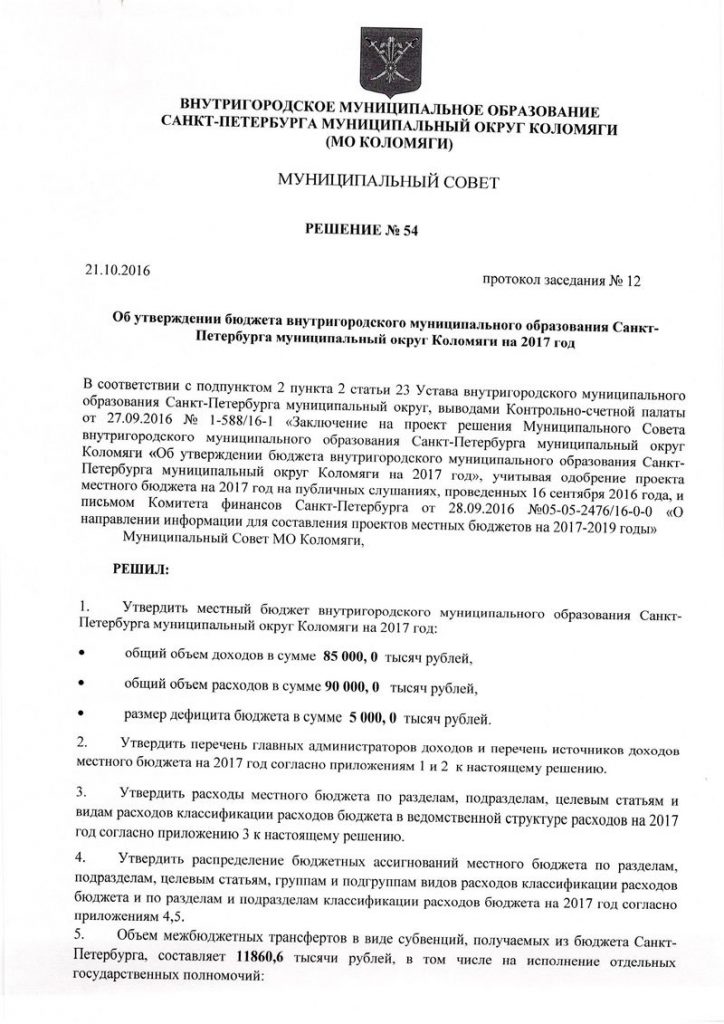 Решение №54 Об утверждении бюджета внутригородского муниципального образования Санкт-Петербурга муниципальный округ Коломяги за 2017 год
