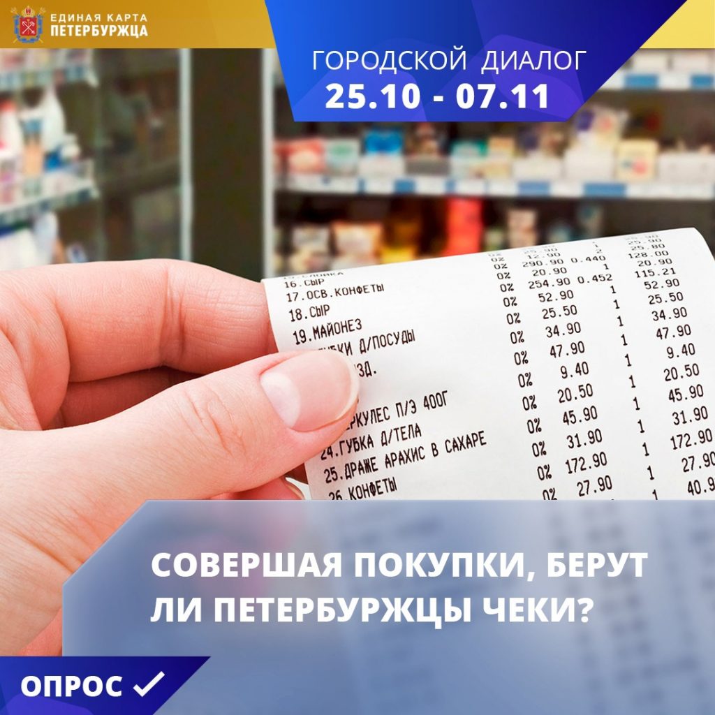На сервисе «Городской диалог» проекта Единая карта петербуржца с 25 октября по 7 ноября проходит опрос «Совершая покупки, берут ли петербуржцы чеки?». Он доступен на портале ekp.spb.ru и в мобильном приложении Единой карты петербуржца.