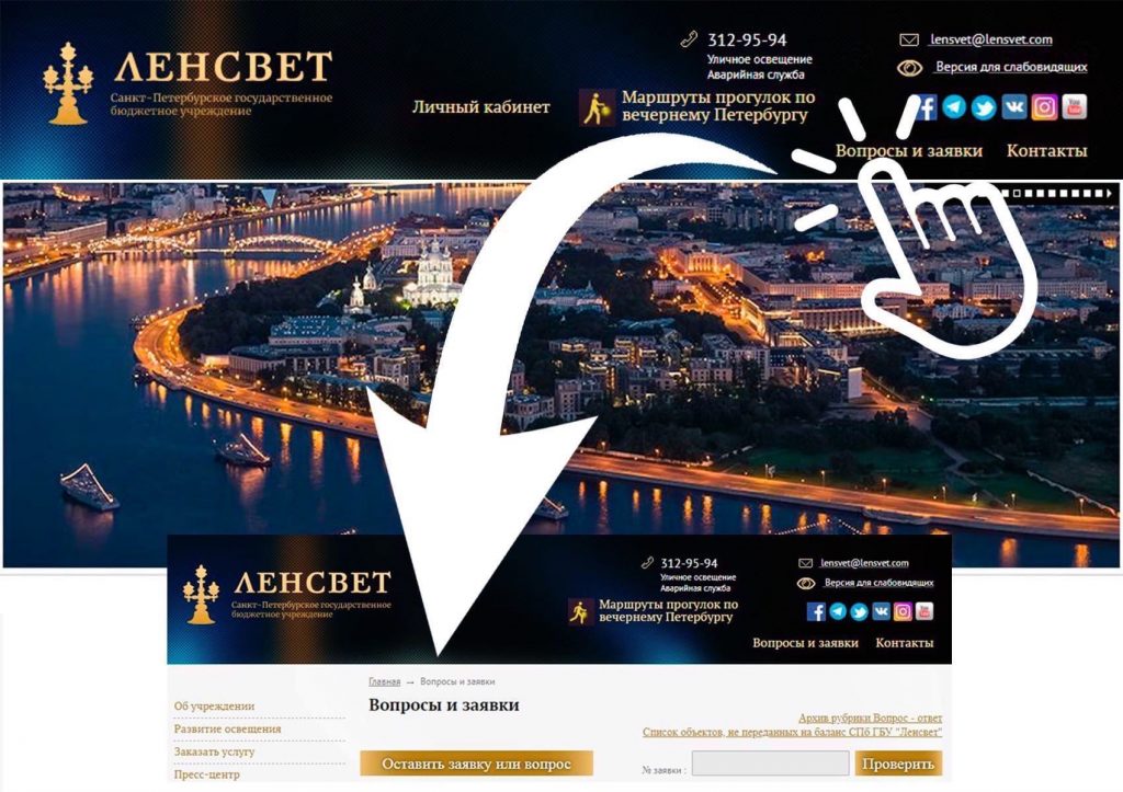 Городское учреждение информирует жителей Санкт-Петербурга о возможности подачи обращений, связанных с работой уличного освещения и архитектурно-художественной подсветки города,  напрямую в СПб ГБУ «Ленсвет» через сервис «Вопросы и заявки» на официальном сайте учреждения с возможностью приложения фотографий.