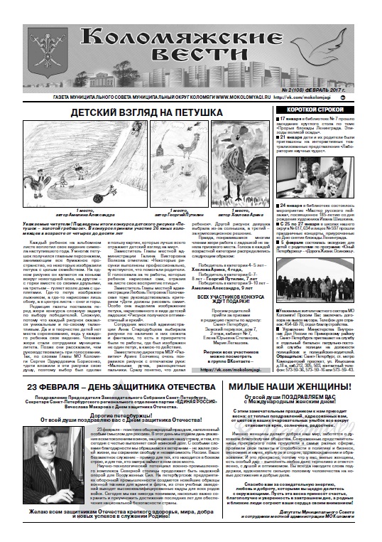 Уважаемые жители, вы можете почитать свежий выпуск газеты «Коломяжские вести» (февраль, 2017) на нашем сайте