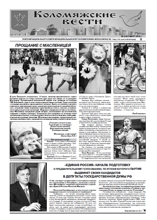 Уважаемые читатели, мартовский номер газеты «Коломяжские вести», №3(97), 2016 год — на нашем сайте: mokolomyagi.ru/files/file/kolom_03_16.pdf