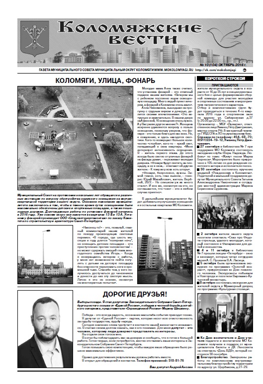Уважаемые жители, октябрьский номер газеты вы можете почитать на нашем сайте — mokolomyagi.ru/files/file/Kolomyagi_10_16.pdf