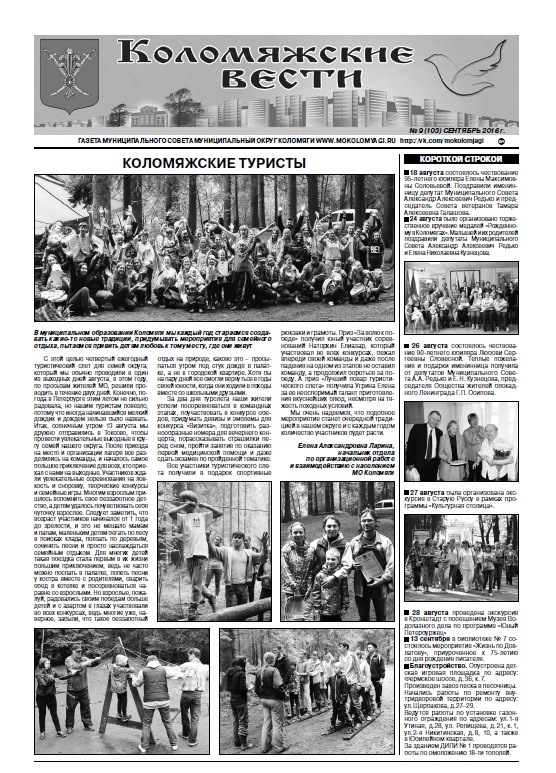 Свежий номер газеты «Коломяжские вести» — сентябрь 2016