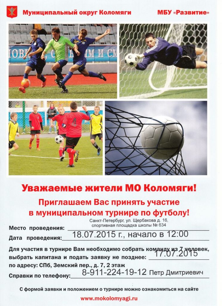 Уважаемые жители! Приглашаем вас принять участие в турнире по футболу, который состоится 18 июля на стадионе школы №634.