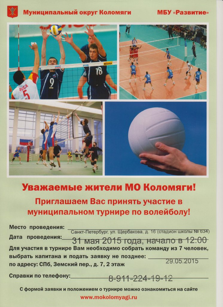 Приглашаем жителей МО Коломяги принять участие в турнире по волейболу, посвященному 70-летию Победы в Великой Отечественной Войне. Турнир состоится 31 мая в 12.00 по адресу: ул. Щербакова, д.16, лит. В (спорт-площадка школы №634)