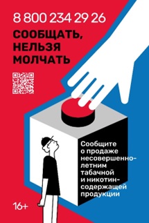 Обращаем ваше внимание, если вы стали свидетелем или знаете о местах продажи несовершеннолетним сигарет, вейпов или заправочной жидкости к ним, сообщите об этом на горячую линию по телефону 8 800 234 29 26