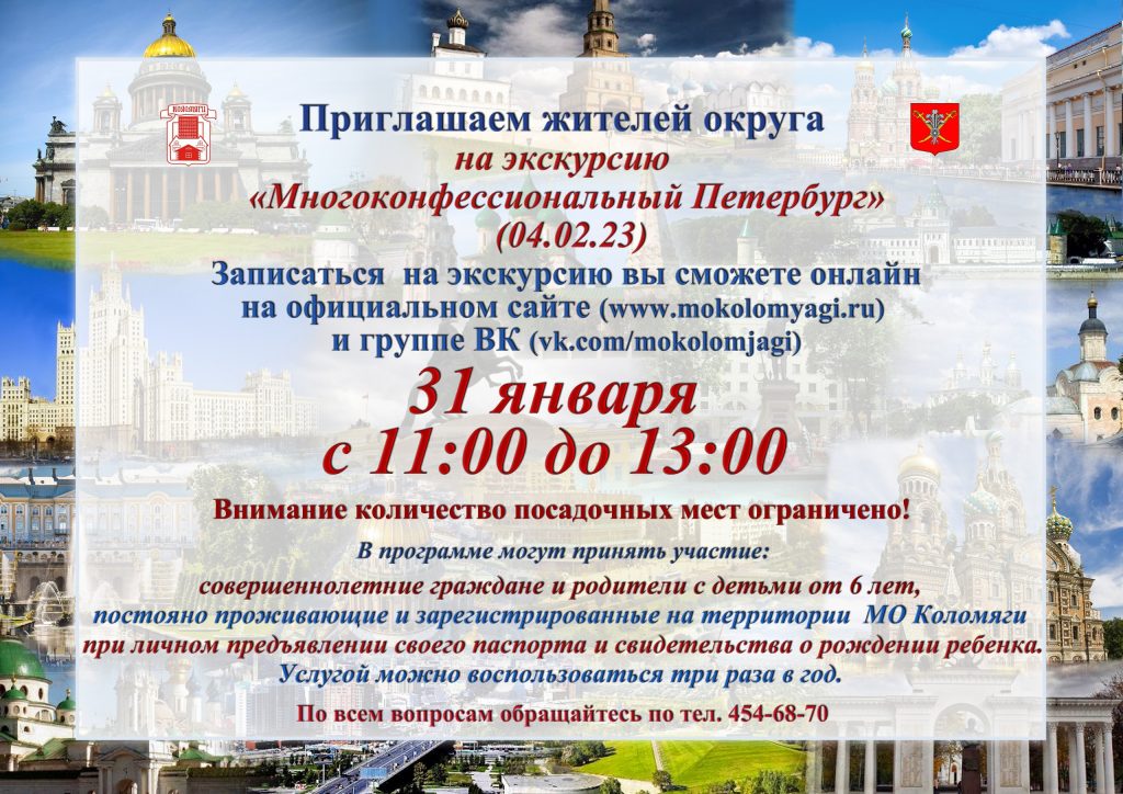 Экскурсии для совершеннолетних граждан и родителей с детьми от 6 лет, постоянно зарегистрированных на территории МО Коломяги.