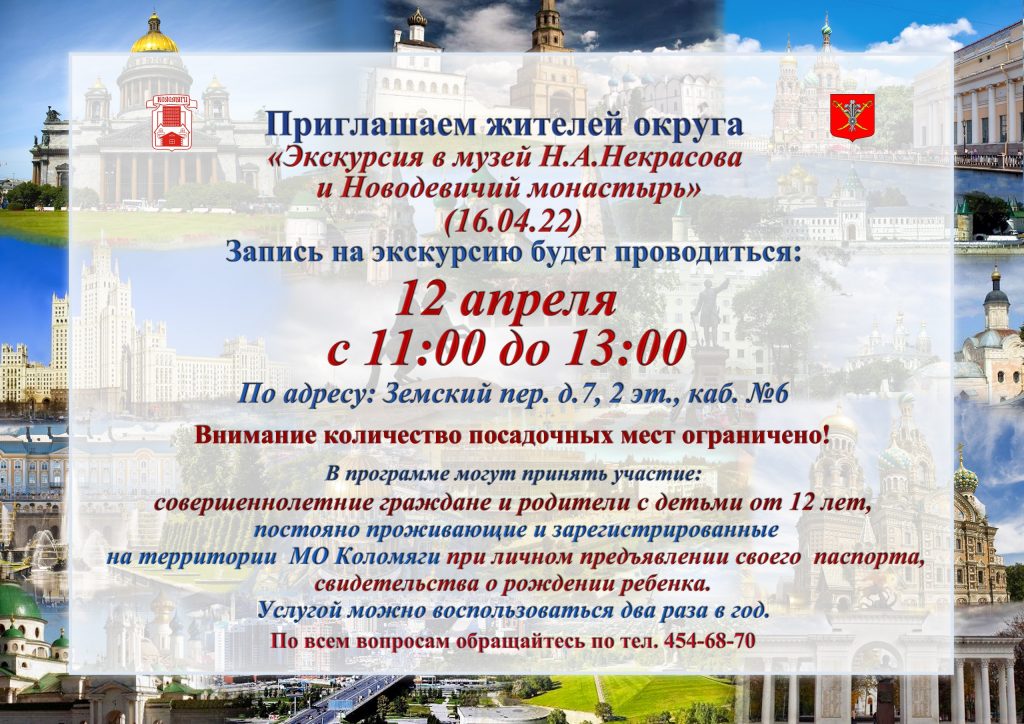 Уважаемые жители МО Коломяги, приглашаем 12.04. с 11:00 записаться на бесплатную автобусную экскурсию «Экскурсия в музей Н.А.Некрасова и Новодевичий монастырь»