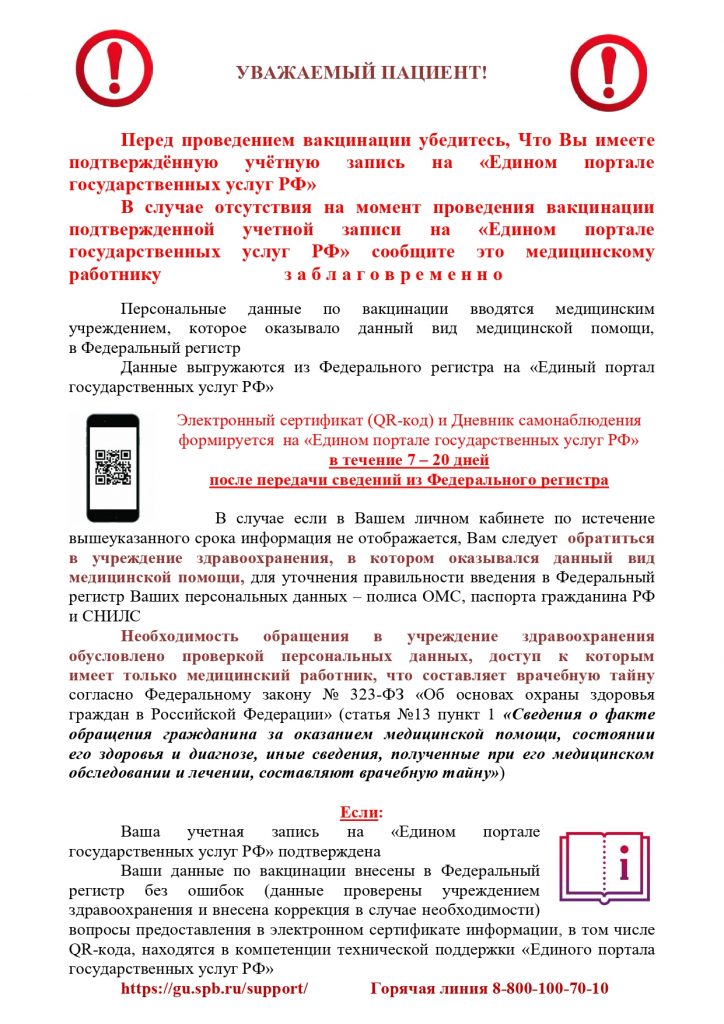 В случае отсутствия на момент проведения вакцинации подтвержденной учетной записи на «Едином портале государственных услуг РФ» сообщите это медицинскому работнику заблаговременно.