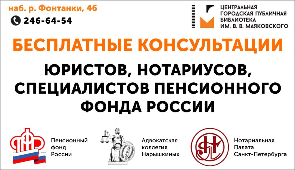 В Центральной городской публичной библиотеке им. В. В. Маяковского для петербуржцев и жителей Ленинградской области организованы бесплатные консультации юристов, нотариусов и специалистов Пенсионного фонда РФ.