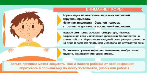 Корь – одна из наиболее заразных инфекций вирусной этиологии, которая передается по воздуху от человека к человеку. Заболевание характеризуется лихорадкой, катаральным воспалением конъюнктивы и слизистых верхних дыхательных путей, этапными пятнисто-папулезными высыпаниями на коже, начиная с головы и далее на туловище и конечности. Для того чтобы не допустить распространения кори среди населения города необходимо своевременное выявление и изоляция больных. При подозрении на заболевание корью врача необходимо вызвать на дом, при необходимости больной госпитализируется в инфекционный стационар.
