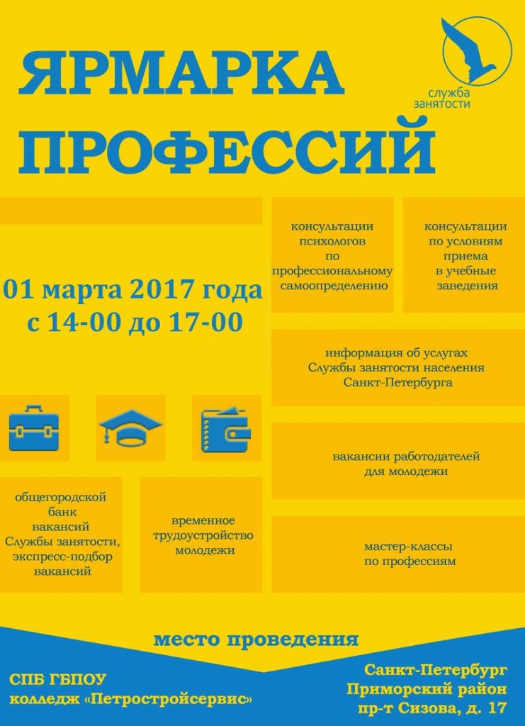 Ярмарка профессий состоится 1 марта 2017 года с 14.00 до 17.00 в СПб ГБПОУ колледж «Петростройсервис» по адресу пр-кт. Сизова, д. 17.
