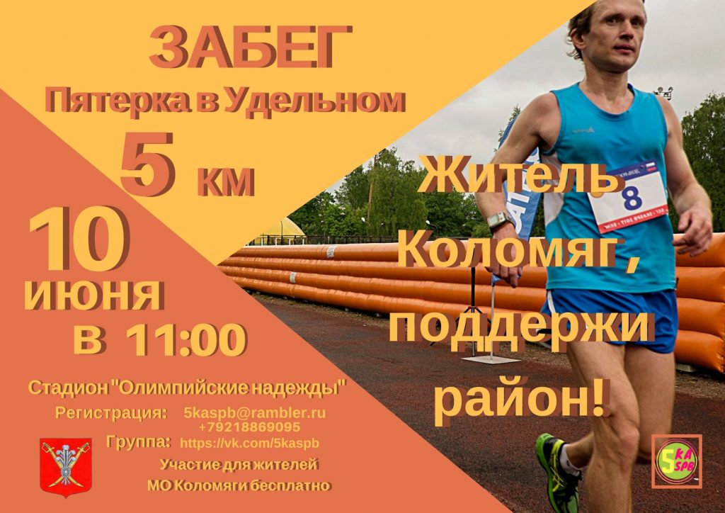 Приглашаем Вас, Ваших друзей и близких принять участие в забеге «5каСПб — Пятерка в Удельном» на 5км, посвященному празднованию Дня России и проводимому при поддержке МО Коломяги 10 июня 2018 года.